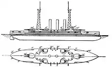 Connecticut was ordered on 1 July 1902.[2] On 15 October 1902, she was awarded to the New York Naval Shipyard.[3] She was laid down on 10 March 1903,[4][3][5] and launched on 29 September 1904.[3][5] She was sponsored by Miss Alice B. Welles, granddaughter of Gideon Welles, Secretary of the Navy during the American Civil War.[6] A crowd of over 30,000 people attended the launch,[7] as did many of the Navy's ships. The battleships Texas, Massachusetts, Iowa, Kearsarge, Illinois, Alabama, Maine, and Missouri were at the ceremony, along with the protected cruisers Columbia and Minneapolis and the auxiliary cruiser Prairie.[8]