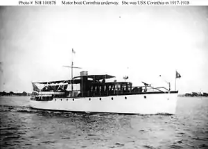 Corinthia was built as a private motorboat of the same name in 1909 by Charles Seabury & Company at Morris Heights in the Bronx, New York. In 1917, the U.S. Navy acquired her under a free lease from her owner for use as a section patrol boat during World War I. She was commissioned as USS Corinthia (SP-938) on 14 May 1917 with Lieutenant, junior grade, P. Herndon, USNRF, in command.