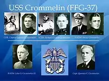 USS Crommelin (FFG-37), twenty-eighth ship of the Oliver Hazard Perry-class of guided-missile frigates, was named for five brothers: Rear Admiral John G. Crommelin (1902–1996), Vice Admiral Henry Crommelin (1904–1971), Commander Charles L. Crommelin (1909–1945), Lieutenant Commander Richard Crommelin (1917–1945), and Captain Quentin C. Crommelin (1919–1997). The Crommelin brothers were the only group of five siblings ever to graduate from the United States Naval Academy. Four of them became pilots, and Time magazine dubbed them "The Indestructibles." The brothers saw action in more than ten campaigns in the Pacific Theater. Henry, the second-oldest, became a Surface Warfare Officer while Richard and Charles died in combat as naval aviators in 1945. Individually and as a fighting family, they gained fame in World War II, attaining outstanding combat records and multiple decorations.[1] Crommelin (FFG-37) is the first ship of that name in the United States Navy.