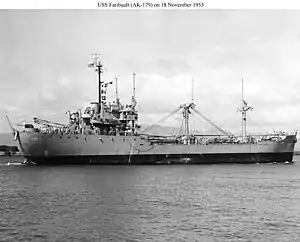 ![]() USS Faribault (AK-179) underway at Pearl Harbor, 18 November 1953. | |