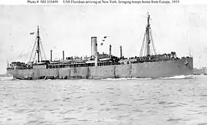 ![]() USS Floridian arriving at New York City from France in 1919 with her decks crowded with American troops returning to the United States after serving in World War I. The Statue of Liberty is in the distance at left. | |