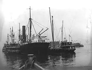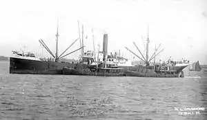 The freight lighters Metcalf No. 1 (left), George H. Johnson (center right), and Catherine Johnson (right) tied up alongside a British cargo ship (center left) on 5 May 1917.