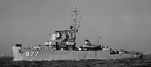 The PCE-877 received its fitting out and shakedown from 14 February 1944 to 31 March 1944 at the Albina Engine & Machine Works shipyard, Portland, Oregon and Naval Base San Diego.