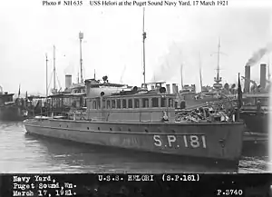 ![]() USS Helori at Puget Sound Navy Yard, Bremerton, Washington on 17 March 1921. Her designation had been changed to YP-181 in 1920, but she still is painted with her previous designation, SP-181. | |
