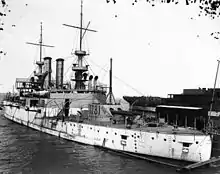 On 4 August 1909, Illinois was decommissioned in Boston.[3] The ship then underwent a major modernization, receiving new "cage" masts and more modern equipment.[4] She spent the next three years in active service with the fleet, before being decommissioned once more on 16 April 1912. She returned to service on 2 November for major training maneuvers with the Atlantic Fleet. Illinois made training cruises to Europe with midshipmen from the US Naval Academy in mid-1913 and 1914. By 1919, she had been decommissioned at the Philadelphia Navy Yard. On 23 October 1921, she was loaned to the New York Naval Militia for training purposes. The 1922 Washington Naval Treaty, which mandated significant reductions in naval strength, stipulated that Illinois must be rendered incapable of warlike action. As a result, she was converted into a floating armory at the New York Navy Yard in 1924 and was assigned to the New York Naval Reserve.[3]