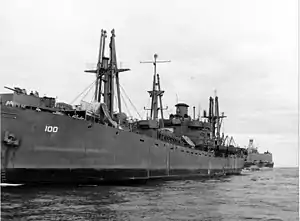 On 27 December 1943, Lynx, with Section 13 of the advanced base sectional dock ABSD-1 in tow astern, sailed as flagship of Task Group (TG) 116.15.3, Commander Arthur S. Walton, in company with sister ships Lyra, towing ARD-12, and Sculptor, with YRD(H)-1 astern, and Albireo, towing YRD(M)-1, escorted by the fleet tug Zuni, set course for the South Pacific. During the afternoon watch on 14 January 1944, Zuni left her position in the formation and came alongside, transferring Sea1c Hugh W. Morris, diagnosed with appendicitis, to Lynx, for medical treatment. Lieutenant Herman E. Wuestenfeld, MC-V(G),[lower-alpha 2] the cargo ship's medical officer, performed an appendectomy later that same day, 20:34-21:40.[4]
