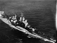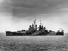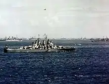Japanese efforts to disrupt the landing culminated in the Battle of Leyte Gulf, an effort by three squadrons to attack the invasion fleet. After the American carrier task force was drawn north by a feint from the Northern Force, the main Japanese unit, the Center Force, attempted to penetrate the San Bernardino Strait. Miami remained with the carriers until the Center Force encountered a group of American escort carriers, destroyers, and destroyer escorts on the morning of 25 October. Frantic calls for support from the Fast Carrier Task Force led its commander, Admiral William Halsey Jr. to detach a group of ships, including Miami, south to stop the Center Force. By the time they arrived, the Japanese had broken off their attack, convinced they had stumbled into TF 38 itself. Miami and several cruisers and destroyers nevertheless caught and sank the destroyer Nowaki on 26 October.[3]