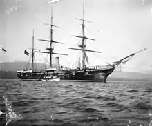 After completion of repairs in January 1893, Mohican was outfitted as flagship for Rear Admiral Joseph S. Skerrett, commander of the Pacific Squadron.[3] Following the overthrow of Hawaii 's last reigning monarch, Queen Liliuokalani, on 17 January 1893, Skerrett and his new flagship, Mohican were ordered to depart for Honolulu on 29 January 1893. With a new Hawaiian provisional government established, Mohican returned to San Francisco in May 1893.[6] She subsequently sailed in June for Alaska to continue her Bering Sea patrols, ending a 22-month cruise at San Francisco 8 October 1894. The ship remained on the Pacific coast, visiting ports in the Northwest and patrolling. On 13 August 1895, during his around the world tour, Samuel Clemens and his family dined aboard at the invitation of Mohican's Executive Officer, Lieutenant Commander Albion Wadhams, described as an old acquaintance of Clemens.[7] Mohican was decommissioned at Mare Island 16 September 1895.