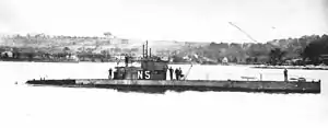 Sailing from New York City on 20 June to New London, Connecticut, for fitting out and thence proceeding to Newport, Rhode Island, to load torpedoes, N-5 began patrols off New England and in Long Island Sound on watch against attacks on coastal shipping by German U-boats. In August and September she deployed under tow by a decoy ship, the sailing vessel USS Charles Whittemore.[1] On 7 September, after parting tow from her escort in a heavy sea, she was mistaken by an armed transport for a U-boat and was fired upon. Fortunately for the submarine, all 15 shells fell short and N-5 was able to proceed on to New London. She continued her patrols until 24 October when she put into New York Navy Yard for repairs, and remained there following the Armistice with Germany until sailing to Philadelphia, Pennsylvania, on 21 February 1919.