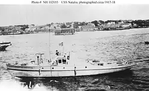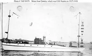 Natalia was built as a private motorboat of the same name in 1909 at either Stamford, Connecticut,[1] or Gloucester, Massachusetts,[2] to a design by Whittelsey & Whitaker. On 8 May 1917 the U.S. Navy acquired her from her owner, John Hayes Hammond, Jr., of either Gloucester[3] or Stamford,[4] for use as a section patrol boat during World War I. She was commissioned the same day as USS Natalia (SP-1251).[5]
