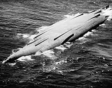 Badly damaged by the loss of a propeller, the ship sailed to Rosyth under heavy escort for repairs on 15 October. At 01:00 the next morning, a U-boat launched three torpedoes at the damaged vessel, all of which passed ahead of her.[21] Unlike in previous cases, sufficient evidence existed to suppose that this torpedo attack was not a false alarm—a number of officers and men aboard New York clearly saw the wakes of the torpedoes in the full moonlight, and a submarine was spotted in the immediate vicinity by a patrol shortly after the attack.[22][Note 1] Ironically, the battleship's wounded condition is possibly what saved her: although standard procedure was to steam at 16 kn (18 mph; 30 km/h), New York could make only 12 kn (14 mph; 22 km/h) on her one operable propeller. Due to this, historian Jerry Jones believes that the U-boat captain misjudged the ship's speed. With no further damage, however, the battleship arrived safely at a drydock in Rosyth. As she was lifted clear of the water, a large dent commensurate with a submarine bow was found in her hull.[22]