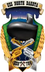 The overall shape of the crest is that of an Indian arrowhead, similar to that used on the coat of arms of North Dakota. This represents the American Indian heritage of North Dakota. Flanking the Indian arrowhead shape and acting as its serrated cutting edge is wheat. This represents the North Dakota farming community. Prominently displayed on the crest are gold and silver six shooter revolvers. The front sights of the revolvers are formed by the gold and silver dolphins, representing the officer and enlisted submarine warfare community. Additionally, the revolvers represent the two UGM-109 Tomahawk payload tubes the boat carries in arsenal. The red and green eyes of the submarine dolphins mounted on the six shooter revolvers pays tribute to the port and starboard running lights of the professional mariner. Across the revolver hand grips are the words "Rough Riders." This is a salute to the state's connection to President Theodore Roosevelt. The Rough Riders were volunteers from the plains during the Spanish–American War. Members of the North Dakota National Guard as well as Roosevelt's Rough Riders served in combat for one year in the Philippines, supporting its occupation following the Spanish–American War. Across the skyline is the silhouette of the first USS North Dakota (BB-29). BB-29 is additionally represented as one of the two gold stars flanking the words, "USS NORTH DAKOTA." SSN-784, the second warship to bear the name, represents the second gold star in this banner. At the base of the arrowhead outline are two horse heads, representing the Nokota horses that roamed the prairies of North Dakota. In the night sky is the constellation Orion. Orion, the hunter, signifies the warrior heart of the people of North Dakota and the war fighting crew of North Dakota. Wrapping across the crest is a banner with two Native American tomahawks, representing the state's Native American Indian heritage and Tomahawk cruise missiles, one of the weapons capabilities North Dakota can employ. Finally, prominently pushing through the ship's crest is a Virginia-Class submarine representing the sailors who operate this warship.