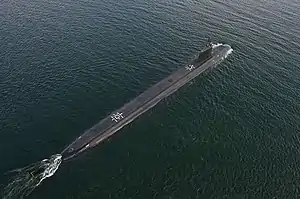 USS North Dakota (SSN-784) is a Virginia-class nuclear powered attack submarine of the United States Navy. She is the second U.S. Navy vessel to be named for the U.S. state of North Dakota, the first being World War I-era battleship USS North Dakota (BB-29). The contract to build her was awarded to Electric Boat division of General Dynamics in Groton, Connecticut on 14 August 2003. Her name was announced on 15 July 2008.[6] and her keel was laid down on 11 May 2012.[7] She was floated on 15 September 2013 and was christened on 2 November 2013, sponsored by Katie Fowler, wife of Vice Admiral Jeff Fowler.[8] She was commissioned in Groton, Connecticut on 25 October 2014.