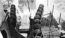 Omaha's main armament went through many changes while she was being designed. Originally she was to mount ten 6-inch (150 mm)/53 caliber guns; two on either side at the waist, with the remaining eight mounted in tiered casemates on either side of the fore and aft superstructures. After the United States entry into World War I the US Navy worked alongside the Royal Navy and it was decided to mount four 6-inch/53 caliber guns in two twin gun turrets fore and aft and keep the eight guns in the tiered casemates so that she would have an eight gun broadside and, due to limited arcs of fire from the casemate guns, four to six guns firing fore or aft. Her secondary armament consisted of two 3-inch (76 mm)/50 caliber anti-aircraft (AA) guns in single mounts. She carried two triple and two twin, above-water, torpedo tube mounts for 21-inch (533 mm) torpedoes. The triple mounts were fitted on either side of the upper deck, aft of the midships catapults, and the twin mounts were one deck lower on either side, covered by hatches in the side of the hull.[4] Omaha was also built with the capacity to carry 224 mines.[7]