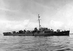 On 23 October, Richard M. Rowell sank the Type-B Mod.2 class Japanese submarine I-54.[2][3] She then took part in the Battle off Samar. On 25 October, Richard M. Rowell was a member of the escort of Taffy One, which was operating off Surigao Island about 130 miles (210 km) south of Task Force 3, which was the subject of the main Japanese attack. Taffy One had just launched planes to the south to attack the Japanese retiring from the Battle of Surigao Strait, when she was subjected to a kamikaze attack by six Japanese planes from Davao. Responding to this emergency, Richard M. Rowell rescued one survivor from the escort carrier Santee. Taffy One arrived too late to be of much assistance to Taffy 3, which bore the brunt of the Japanese attack; Richard M. Rowell did fight off another kamikaze attack on 26 October.[4] Returning to the carrier formation, she donated blood plasma from her own supply, and medical supplies from USS Petrof Bay, to Suwanee. On 27 October, Richard M. Rowell escorted Santee to Manus, and arrived at Pearl Harbor on 19 November.