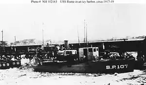 ![]() USS Riette in an icy harbor sometime between 1917 and 1919. Patrol boats USS Uncas (SP-689) and USS Perfecto (SP-86) are partially visible at left. | |