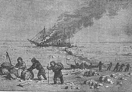 Rodgers then drifted up the bay, her rigging and sails ablaze. Early the next day her magazine exploded. A temporary shore camp sheltered the crew until the next day when they moved to the village of Noomamoo, seven miles (10 km) away. Later divided into four parties, most of the crew wintered there and in three nearby villages.