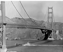 USS St. Francis River transiting under the Golden Gate Bridge during her sea trials following recommissioning in 1965