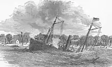 At this point, the two ships were about 10 feet (3.0 m) apart, but could barely see each other due to dense smoke.[15] It was now about 06:00, and the ships were at a point about 9 miles (14 km) upriver from the forts.[17]Varuna turned to starboard to allow for a broadside to be fired from that side of the ship.[16] The broadside caused great destruction on Governor Moore's deck,[15] but Governor Moore rammed Varuna, knocking out the Union ship's engines. Governor Moore then backed off and rammed Varuna again.[16] Varuna was now sinking rapidly, and steered towards the riverbank.[18] The gunboat CSS Stonewall Jackson then arrived and rammed Varuna.[19][4][lower-alpha 1] Varuna sank within 15 minutes, with her guns still firing as she went down. Eight sailors aboard the vessel later received the Medal of Honor for their actions in the engagement.[19] Governor Moore in turn was scuttled not long after her victory over Varuna.[21]