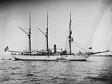 Vicksburg left Newport, Rhode Island on 16 January 1898, sailing for the Caribbean.[3] On 26 April, at the start of the Spanish–American War, she sailed south to join in the blockade of Cuba.[4] For the next three months, Vicksburg patrolled the Cuban coast near Havana, returning to Key West, Florida periodically for fuel and provisions. During her tour of duty in Cuban waters, she captured three blockade runners. In May, she took Oriente,[5] Fernandito,[6] and Bernardico[7] on the 5th, 7th, and 9th, respectively. The Oriente and Fernandito were small unarmed sailing ships bound from the Gulf of Campeche to Havana with cargoes of fish. Vicksburg took each to Key West where they were condemned by a prize court.[8][9] Her fourth and final capture came more than a month later on 24 June when she encountered Ampala, a 150 long tons (150 t) sailing vessel, bound from Havana to Trujillo.[10] Though Ampala carried no cargo save provisions for her passengers, Vicksburg took her to Key West where she, too, was duly condemned.[11][12] On 7 May, Vicksburg came under the fire of the Santa Clara Battery shore battery near Havana,[1] and again on 14 August.[13] By then, hostilities in Cuba were ending, and the need for blockading ships diminished.[14][15] Vicksburg departed Cuban waters on the 14th and, after a three-day stop at Key West,[16] continued north to Newport where she arrived on 23 August.[13][17] During the remaining months of 1898 and the first five months of 1899, she operated along the east coast and in the Caribbean.[18][19][20][21] On 24 May 1899, Vicksburg was placed out of commission at Boston.[22][23]