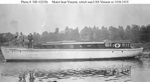 Vincent was built as a civilian wooden single-screw cabin motorboat of the same name in 1909 by Britt Brothers at Lynn, Massachusetts. The U.S. Navy acquired her under a free lease from her owner, the Transfer Company of Norwich, Connecticut, for use as a section patrol boat during World War I; sources differ on the date of the acquisition, suggesting that it could have happened in both June 1917 and June 1918.[1] She was commissioned as USS Vincent (SP-3246); sources disagree on her commissioning date, stating that it was 28 June 1917,[2] 20 June 1918,[3] and 28 June 1918