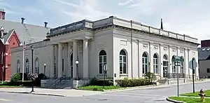 The US Post Office-Johnstown is a historic post office building located at 14 North William Street in Johnstown, Fulton County, New York. It was designed and built in 1912–1913, and is one of a number of post offices in New York State designed by the Office of the Supervising Architect of the Treasury Department, James Knox Taylor. It was enlarged in 1965–1966. The original section is a five-by-seven-bay, 1-story limestone structure on a granite foundation in the Classical Revival style. The entrance portico features four Doric order columns supporting an entablature. The building also features semi-circular arched windows.[2]