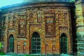 It is a one-storey building. The building has the same length and width which is 21 ft and 6in. The width of the verandah is slightly above 3 ft wide. It has four domes. It has one large dome on the main building and three smaller domes on the verandah. There are 15 doors and windows, almost equal in size. The thickness of the walls are all roughly 5 ft apart from the western wall which is about 10 ft. It has six decorative pillars in the four corners of the main hall and two corners of the verandah. There is a large pond behind the mosque.[5] The mosque has three doorways, with the middle one much larger than the others.[6] There is a minaret separate from the mosque which is not extremely tall.