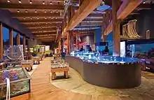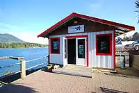 After operating the temporary facility to evaluate the feasibility of the project (the "Mini-Aquarium"), enough support was garnered to justify the construction of a permanent aquarium in a nearby location overlooking Ucluelet Harbor, which opened its doors on 1 June 2012. Groundbreaking for the new aquarium was on 29 June 2011.[1] The government of Canada provided $270,500 investment through the Western Diversification Program, and the West Coast Community Adjustment Program contributed $250,000 towards the project.[2] The permanent facility enriches the existing intertidal beach habitat by feeding several tidepools with outflowing seawater from the building, which will increase the diversity of life in the immediate area and provide more living habitats for visitors to explore in the publicly accessible beach area. The building incorporates the latest in sustainable green technology and showcases this to visitors so that they can leave with a greater understanding of how to achieve energy efficiency in their own homes.
