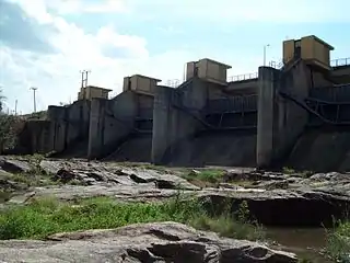 The Udawalawe Dam is a large irrigation dam in Udawalawe, in the Southern Province of Sri Lanka. The dam consists of an embankment section and a gravity section, combining the total dam length to approximately 3.9 km (2.4 mi). The dam is also used for hydroelectric power generation, powering three 2 MW units, commissioned in April 1969.[1]