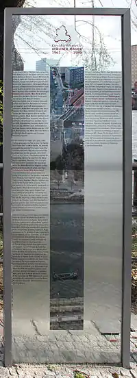 During the escape, people from West-Berlin watched the action. However, they had to stay on the wharf because the Spree fully belonged to the territory of East Berlin. The day after his death, 2.500 people from West Berlin gathered at Gröbenufer, for a funeral. The brother of Udo Düllick, who was living in the West, identified the corpse. The funeral service was on October 18, 1961 on the Jerusalem cemetery in Berlin-Kreuzberg.[2] Gröbenufer today has a memorial stone, which was erected the same year. A cross of the memorial White Crosses on Reichstagufer commemorates Udo Düllick.