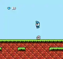 Every character can attack enemies and bosses by jumping on them while holding the d-pad down. When defeated, enemies will spawn into balloons called "Popoons", which can be thrown at other enemies and bosses.[2][3][4] The game has a hit point-based health system, starting at 10 HP but can be expanded by searching life containers and replenished after getting hit by enemies by finding medicines or the "Water of Life".[2][3][4] The game is over once the characters' HP is depleted, though the player can continue with their items and characters via a password system.[3][4][5]