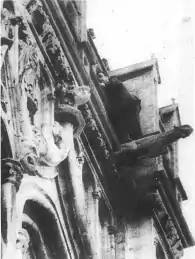 On 29 September, Wood joined a public tour of Amiens Cathedral, approximately 3 miles (4.8 km) away from Ledez's birthplace, but broke away from the tour group at about 12 noon, climbed over the parapet, and clung to a gargoyle about 200 feet (61 m) above the ground, threatening to commit suicide by jumping off.[20][24][25] He left a note with a member of staff at the cathedral shortly beforehand informing them of his intention to commit suicide, which prompted them to call the police.[25]