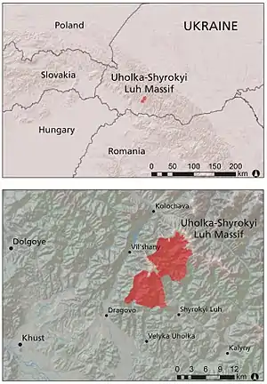 The protected forest area, Uholka-Shyrokyi Luh, is located in the Trancarpathian region of Ukraine and belongs to the Carpathian Biosphere Reserve. It is the largest primeval beech forest worldwide with an area of 8800 ha.[1] Since 1920, some parts of this forest have been protected. In 1992, Uholka-Shyrokyi Luh primeval beech forest was designated as UNESCO World Heritage Site. Later, several other primeval and old-growth beech forests in Europe were included (in 2007 and 2011) in the UNESCO World Heritage Site Ancient and Primeval Beech Forests of the Carpathians and Other Regions of Europe[2] as well.