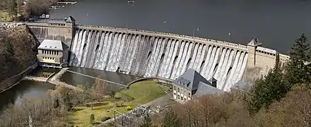 View from the viewpoint at the Uhrenkopf to the overflowing Edersee Dam