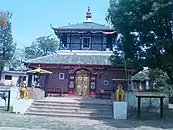 Various deities were worshipped and auspicious time was determined to ensure victory before initiating war with British forces on the 1814-1816 war. Ujir Singh then touched the feet of a 16 handed Mahishashur Mardini Bhagwati deity in Tansen Bazaar and took solemn vow to spread her fame by constructing a temple and initiating a Sindoor Jatra (procession of vermillion) upon the victory of Gorkhali forces in the war.[8] After the victory of the Gorkhali forces, he began the construction of a three storied temple in 1872 V.S. which was accomplished in 1876 V.S. After the completion of construction of the temple, he donated gold equivalent to his height as the Gajur (pinnacle) for the temple and constructed silver canopied Mahishashur Mardini Bhagwati whose 18 arms were built of Ashtadhatu (octo-alloy).[8] He started the Khat Jatra, together with Palpa Bhagwati's Sindoor Jatra, on the day of Bhadra Krishna Nawami in 1877 V.S.[8] For the purpose of worship and rituals, he had invited Chandramani Gubhaju of Patan to perform Nitya Naumaitik Puja, Barsha Bandhan Puja and Tantric rituals during Kalaratri, Chaite Dashain, and others. The procession is observed till date as celebration of victory.[8]