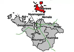 Ukerewe District[1] is one of the seven districts of the Mwanza Region of Tanzania. It is located on Ukerewe Island, Ukara Island and other neighbouring islands within Lake Victoria. The largest settlement and the district's administrative capital is Nansio. As of 2002, the population of Ukerewe District was 261,944.[2] By 2012, the official population of Ukerewe District was 345,147.[3]