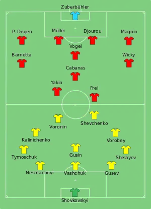 In the 70th minute, Shevchenko was tripped in the penalty box by Karim Hagui and scored from the resulting penalty, shooting right footed to the goalkeepers left as he dived to his right. Ukraine's victory sealed second spot in the group and a second round match against Switzerland. Vyacheslav Sviderskyi and Andriy Rusol were both suspended from the second round after picking up bookings in the match.[12]
