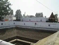 The temple is located in central Kanchipuram, a locality in the Central side of Kanchipuram, a South Indiann town in the state of Tamil Nadu.[11] The temple has an area of about 60,000 square feet (5,600 m2) and has a three tiered rajagopuram (main towers) with seven kalasas. The temple houses four divya desams on its own – they are Thirukkarvaanam, Thirukaaragam, Thiruooragam and Thiruneeragam.[12] It is believed that all the shrines were probably separate temples, but the circumstances which lead do these temples getting housed in the Ulagalantha Perumal temple is not known.[13] Thirumangai Azhwar has sung praises of all the four temples in a single verse. The temple tank, Naga Tirtha, is located outside the main temple complex.[14]