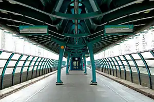 The design of Ulitsa Skobelevskaya station is simple and almost identical to the four other stations to the south. It is located on an elevated viaduct with a light green and curvy canopy stretching over the entire platform. There are large sound and wind barriers on either side of the platform. The single island platform itself is 90m (295 feet) long, 7m (22 feet) wide, and 9.6 (31 feet) above the ground.