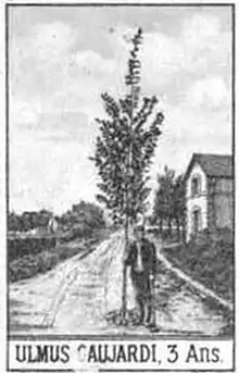 The hybrid elm cultivar Ulmus × hollandica 'Gaujardii', one of a number of cultivars arising from the crossing of Wych Elm U. glabra with Field Elm U. minor, was raised by the Gaujard-Rome nursery of Châteauroux, France, in the 1890s as Ulmus Gaujardii and was described in the 1898 Kew Bulletin and Wiener illustrirte Garten-Zeitung.[1][2] It won first prize in the International Horticultural Exhibition in Saint Petersburg, Russia, in 1899 and a silver medal in the Heemstede Exhibition, The Netherlands, in 1925.[3] From the early 20th century it was distributed by the Späth nursery of Berlin as Ulmus montana Gaujardi,[4] and in the interwar years by the Boccard nursery of Geneva as Ulmus campestris Gaujardi.[5] It appeared in Unsere Freiland-Laubgehölze in 1913, but without description.[6][7]