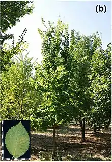 'Dehesa de la Villa' is monopodial, growing at a comparatively modest rate of 63 cm per annum in the trials at Puerta de Hierro, Madrid. The branches are devoid of corky tissue. The leaves, on 6 mm petioles, are elliptic, typically acuminate at the apex, the average length and width 55 × 36 mm, the margins doubly serrate. Foliar density relative to 'Sapporo Autumn Gold' is described as 'high'. In the Madrid study, the appearance of the tree was rated 4.3 / 5.[1] The tree was the first of the Madrid clones to leaf in southern England, flushing in the first week of April.[2]