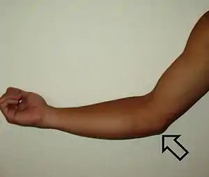 The UCL is important because it stabilizes the elbow from being abducted. If intense or repeated bouts of valgus stress occur on the UCL, injury will most likely transpire. Damage to the ulnar collateral ligament is common among baseball pitchers and javelin throwers because the throwing motion is similar. Physicians believe repetitive movements, especially pitching in baseball, cause adolescents' UCL injuries. Furthermore, physicians have stated that if an adolescent throws over 85 throws for 8 months or more in a year, or throw when exhausted, the adolescent has a significantly higher risk of succumbing to a UCL surgery.[5] Gridiron football, racquet sports, ice hockey and water polo players have also been treated for damage to the ulnar collateral ligament.[6][7] Specific overhead movements like those that occur during baseball pitching, tennis serving or volleyball spiking increase the risk of UCL injury.[8] During the cocking phase of pitching, the shoulder is horizontally abducted, externally rotated and the elbow is flexed. There is slight stress on the UCL in this position but it increases when the shoulder is further externally rotated. The greater the stress the more the UCL is stretched causing strain. During the overhead throwing motion, valgus stress on the medial elbow occurs during arm cocking and acceleration. The initiation of valgus stress occurs at the conclusion of the arm-cocking phase. In the transitional moment from arm cocking to arm acceleration, the shoulder vigorously rotates internally, the forearm is in near full supination, and the elbow flexes from 90° to approximately 125°. From late cocking to ball release, the elbow rapidly extends from approximately 125° to 25° at ball release.[9] This causes tremendous valgus stress and tensile strain on the UCL. Injuries to the ulnar collateral ligament are believed to result from poor throwing mechanics, overuse, high throwing velocities, and throwing certain types of pitches, such as curveballs.[10] Poor mechanics along with high repetition of these overhead movements can cause irritation, micro-tears or ruptures of the UCL. Kinetic chain dysfunction due to poor lower extremity strength, core strength and stability can be associated with UCL injuries as well as capsular stiffness in glenohumeral internal rotation deficit (GIRD), and scapular dyskinesis.[11][12] Injuries to the Ulnar Collateral Ligament in baseball players are rarely due to one-time, traumatic events. Rather, they are more often due to small chronic tears that accumulate over time.
