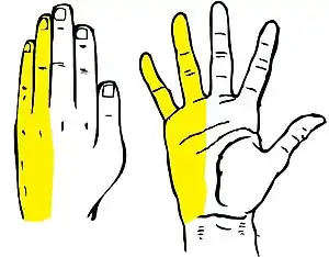 | Cartoon depiction of classic ulnar sensory distribution, including mid-4th and 5th fingers. Note that this diagram does not portray hand muscles affected by ulnar neuropathy. | |