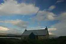 "Sheila's Cottage" is a thatched but and ben, which was restored in the 1990s. It is named for Sheila MacFadyen (Sile NicPhaidein), who lived in the cottage between the turn of the 20th century and the early 1950s. Sheila was originally a milkmaid at Ulva House, but she spent her later years, after her son predeceased her, garnering a scanty living by gathering and selling winkles for sale locally. One room, the "but" was for livestock, and the other, the "ben" was her living space, where all activities took place.