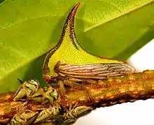 Female Umbonia crassicornis often deposit about 100 eggs at a time into a plant stem,[2] under the bark. However, sometimes a female will lay her eggs in the leaf petiole even though they can be shed occasionally. The female will choose her brooding site based on if she can wrap her legs around the branch (diameter about 3.8mm)[3] The mother will stay with the clutch (a group of young) until the nymphs are mature. Without an adult female present during the nymphs development, the survival rate of the clutch drops from 53% survival to 27%.[3] If a clutch's defending female dies, the clutch can be adopted by a nearby female and the two clutches will combine into one, though the survival rate decreases significantly.[3]