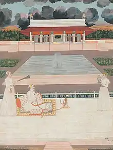 ![]() Umdat al Mulk reclining on cushions while being attended to by servants. | |