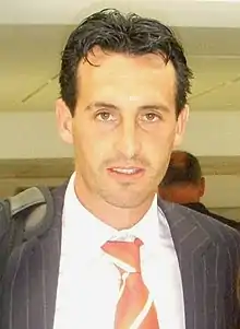 His father and grandfather, named Juan and Antonio respectively, were also footballers, both goalkeepers. The former appeared for several clubs in the second tier, while the latter competed with Real Unión in the top division.[4][5][6] Emery's uncle, Román, played as a midfielder.[7][8] Emery, a left-sided midfielder, was a youth graduate of Real Sociedad, but never really broke into the first team (aged 24 he appeared in five La Liga games, scoring against Albacete Balompié in an 8–1 home win).[9] After that, he resumed his career mostly in the Segunda División, amassing totals of 215 matches and nine goals over seven seasons. He retired with Lorca Deportiva CF at the age of 32, after one season in Segunda División B.