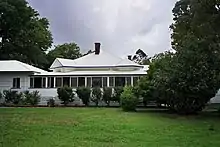 Vehicle access to the site is provided on the southern end of the site and a large expanse of gravel driveway occupies this end of the site. Also on this side of the site are mature trees including a Kauri Pine and other pines and a Liquid Amber. Along the Eastern elevation is a tall camellia hedge and two large camellia shrubs flank the entry path. At the rear of the site are a large Magnolia tree, oak tree, long leaf pine and a timber tank stand covered with wisteria.[1]