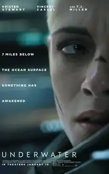 Underwater is a 2020 American science fiction action horror film directed by William Eubank.[4] The film stars Kristen Stewart, Vincent Cassel, Jessica Henwick, John Gallagher Jr., Mamoudou Athie, and T.J. Miller.[5]