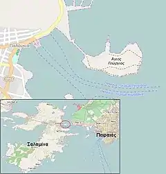 ![]() Map of the island of Salamis. The current ferry line to/from Perama can be seen in the north-east (blue intermittent line) | |